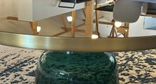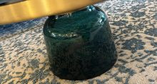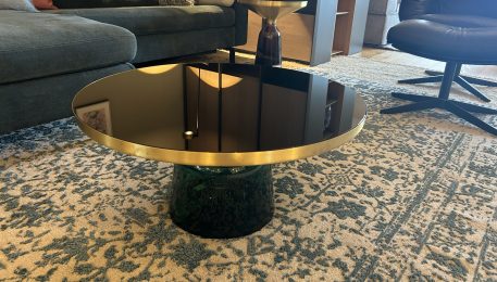 stylischer Beistellisch aus Glas mit Messingaufsatz